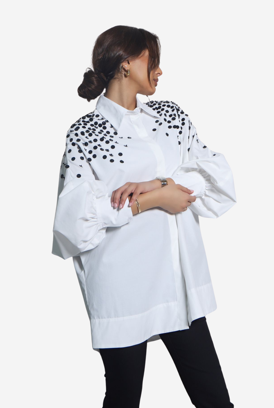 بلوزة قصيرة بتصميمات دائرية على الكتف